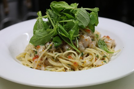 ホタテとイクラの冷製スパゲティー 梅とゴマのアクセント